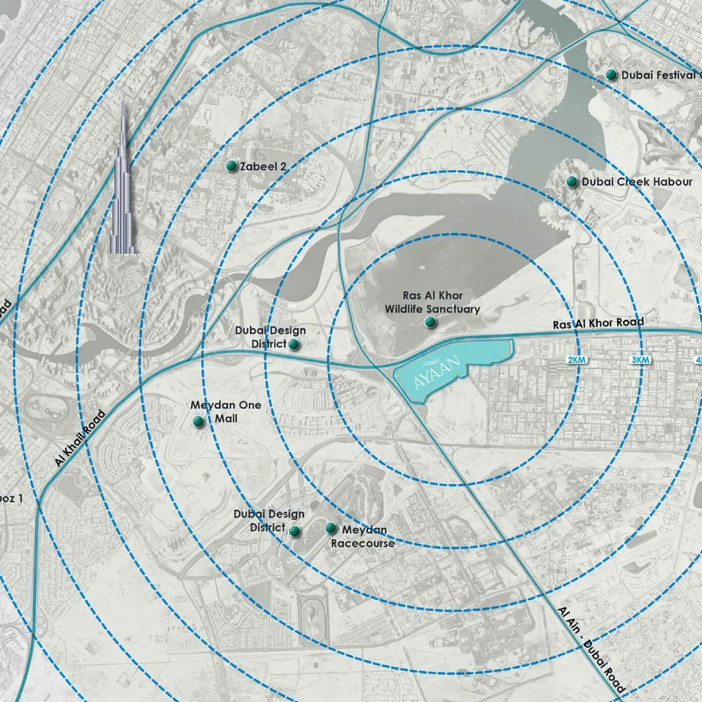 Ayaan Heights by IGO in Meydan Horizon is located near Dubai – Al Ain Road (E66) and Al Khail Road (E44).
